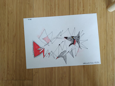 Dopo aver preparato una solida base capace di accogliere e sostenere tutto ciò che avrebbe potuto emergere, sgombrando la mente da qualunque pensiero abbiamo lasciato la nostra mano libera di tracciare linee apparentemente casuali, concedendo alla nostra mente di lasciar fluire i pensieri senza esserne influenzati.